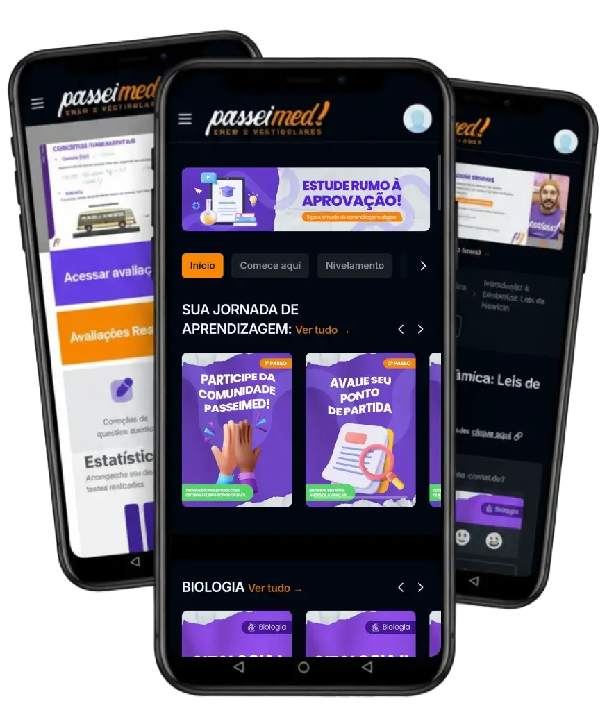 Com mais de 50% de alunos aprovados em Medicina no curso presencial e milhares de estudantes conquistando suas vagas ao longo dos anos, a Passei! se consolidou como referência na preparação para o ENEM e vestibulares. Nosso método é científico, baseado em análise real das provas, ministrado por professores especialistas e com acompanhamento humanizado — tudo pensado para garantir a sua conquista.